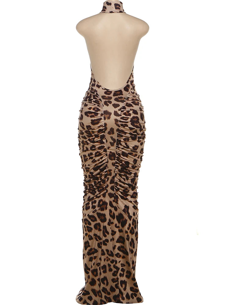 This striking leopard print dress combines timeless animal-pattern appeal with contemporary silhouette design. The halter neckline and sleeveless cut create an open, airy aesthetic perfect for warm-weather occasions, while the backless detail adds an unexpected touch of allure. Crafted from stretch fabric, the dress hugs your curves with a slim, flattering fit that moves with you. The ruched detailing enhances your natural contours and adds visual interest. Versatile enough for date nights, cocktail events, or elevated casual outings, this piece transitions seamlessly from day to evening with the right accessories.